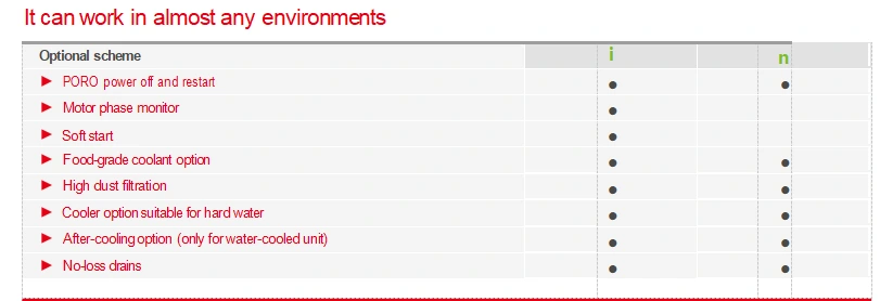 Наши компресори нуде расхладне течности за храну, високу филтрацију прашине и хладњаче тврде воде и друге опције прилагођене тешким окружењима, које могу да задовоље ваше потребе за вишеструким применама.