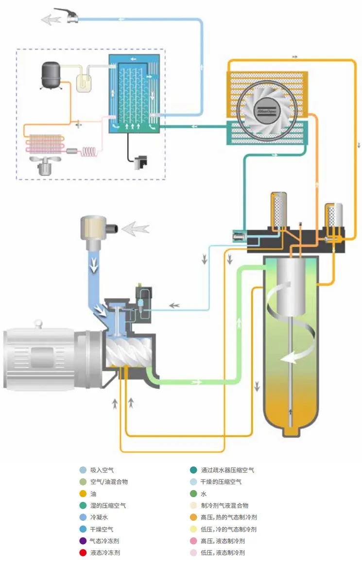 ·Уграђени сушач има противструјни измењивач топлоте, уграђени сепаратор воде и може подесити сушач према оптерећењу ваздушног компресора.