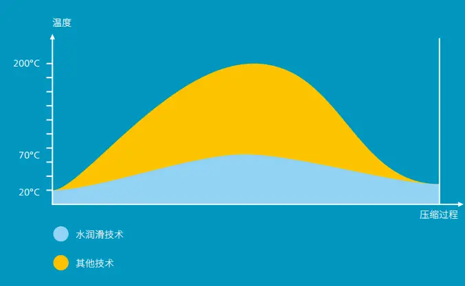 Вода има одличну снагу хлађења и ефикасно уклања топлоту из извора. Енергетски отпад узрокован стварањем топлоте је елиминисан, а више компримованог ваздуха се може произвести по киловату енергије. Хладнији компримовани ваздух смањује термички стрес на компонентама, чиме се продужава радни век.