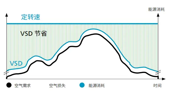 Потрошња енергије компресора чини више од 70% трошкова целог животног циклуса, а производња компримованог ваздуха троши више од 40% укупног рачуна за електричну енергију у фабрици. Да би смањио потрошњу енергије, Атлас Цопцо је развио ВСД компресор ваздуха без уља и воде. Цопцо нуди широк спектар ваздушних компресора са варијабилном брзином (ВСД) на тржишту.